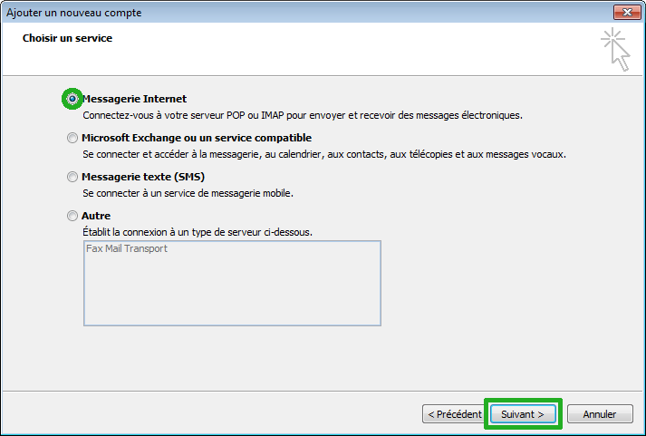 valider la case « messagerie internet » puis cliquer sur suivant :