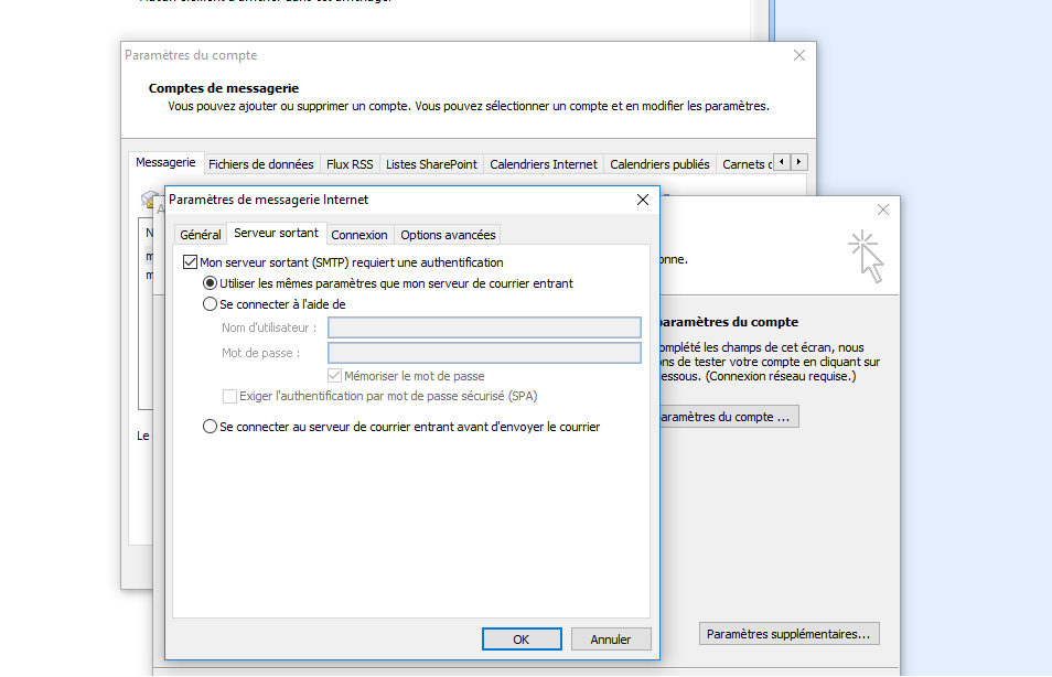 dans l’onglet serveur sortant cocher la case “Mon serveur sortant (SMTP) requiert une authentification” puis « Utiliser les mêmes paramètres que mon serveur de courrier entrant. »
