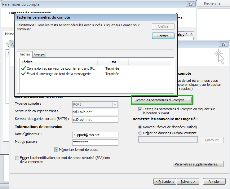 Puis pour finir cliquez sur « tester les paramètres du compte » vérifier si tout les paramètres sont correcte et que la messagerie fonctionne correctement .